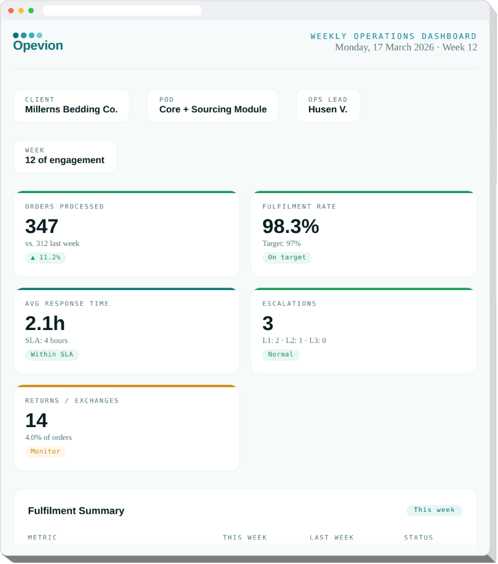 Opevion runs AI-powered Operations Pods so you can focus 100% on growth — without the overhead of a full in-house team.